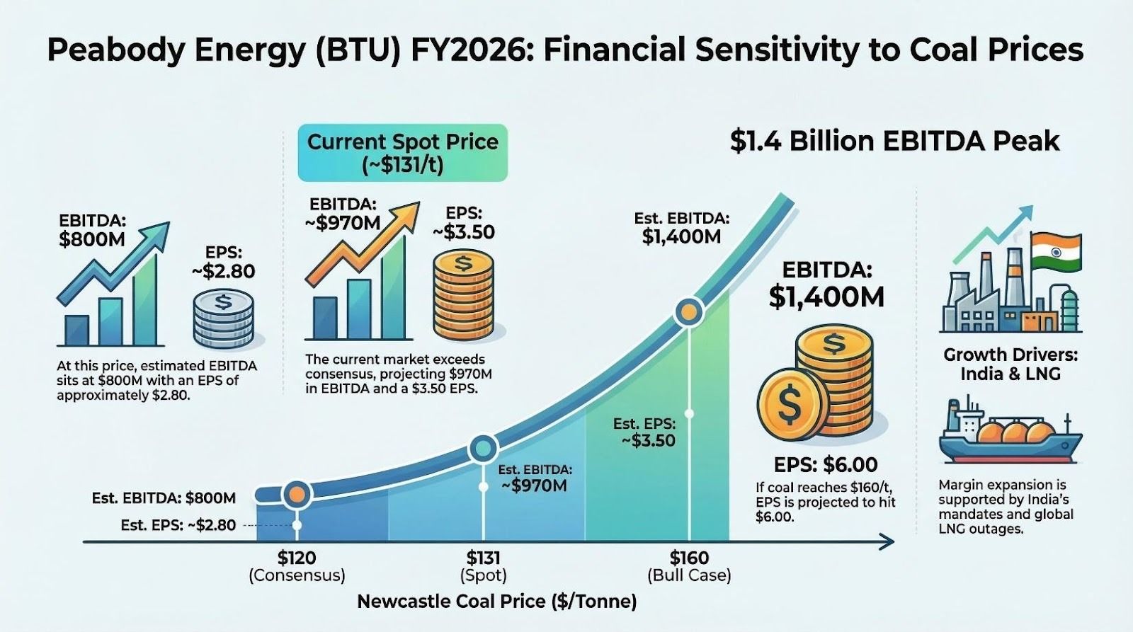 The critical number: for every $10/tonne increase in the Newcastle benchmark, BTU's EBITDA rises approximately $65 to $75 million. The move from the $93 mid-2025 trough to the current $131+ represents roughly $240-280 million in annualized EBITDA uplift that consensus estimates were not built around.