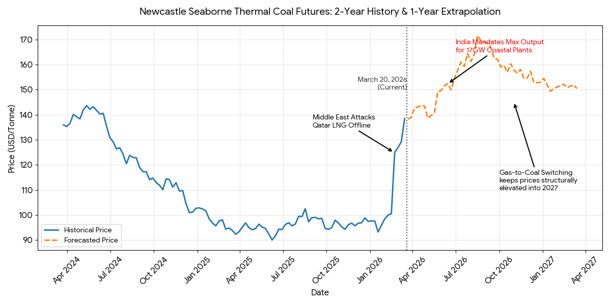 The difference between this and prior spikes: the physical damage to Ras Laffan is not a weather event or a political standoff. It is concrete, structural, and multi-year. The floor for coal prices just moved.
