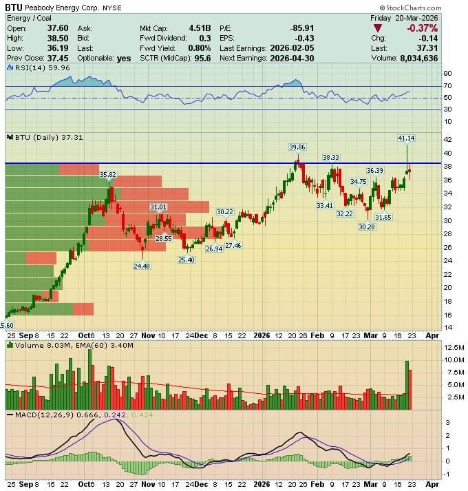 Peabody Energy ($BTU) is the largest private-sector coal company in the world. Based in St. Louis, $4.5 billion market cap, net cash balance sheet with roughly $575 million in cash against $321 million in long-term debt. Total liquidity exceeding $900 million.